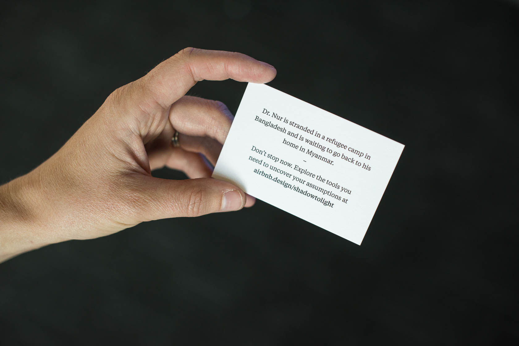 Moving beyond Shadow to Light, our next step was to provide our attendees with practical tools to move from self reflection to action. Together with News Deeply, Airbnb Design research team created a virtual deck of cards with guiding principles that we hope can prompt a change in perspective during the creative process. This interactive tool, which we call Another Lens, poses a series of questions that encourage its audience to balance their bias, consider the opposite, and embrace a growth mindset. The questions are paired with background information and research that puts them into context, and suggests specific ideas for action. Finally, we invited Lara to host a conversation around bias with the community, as part of our Design — Talk series, so we can continue the conversation.