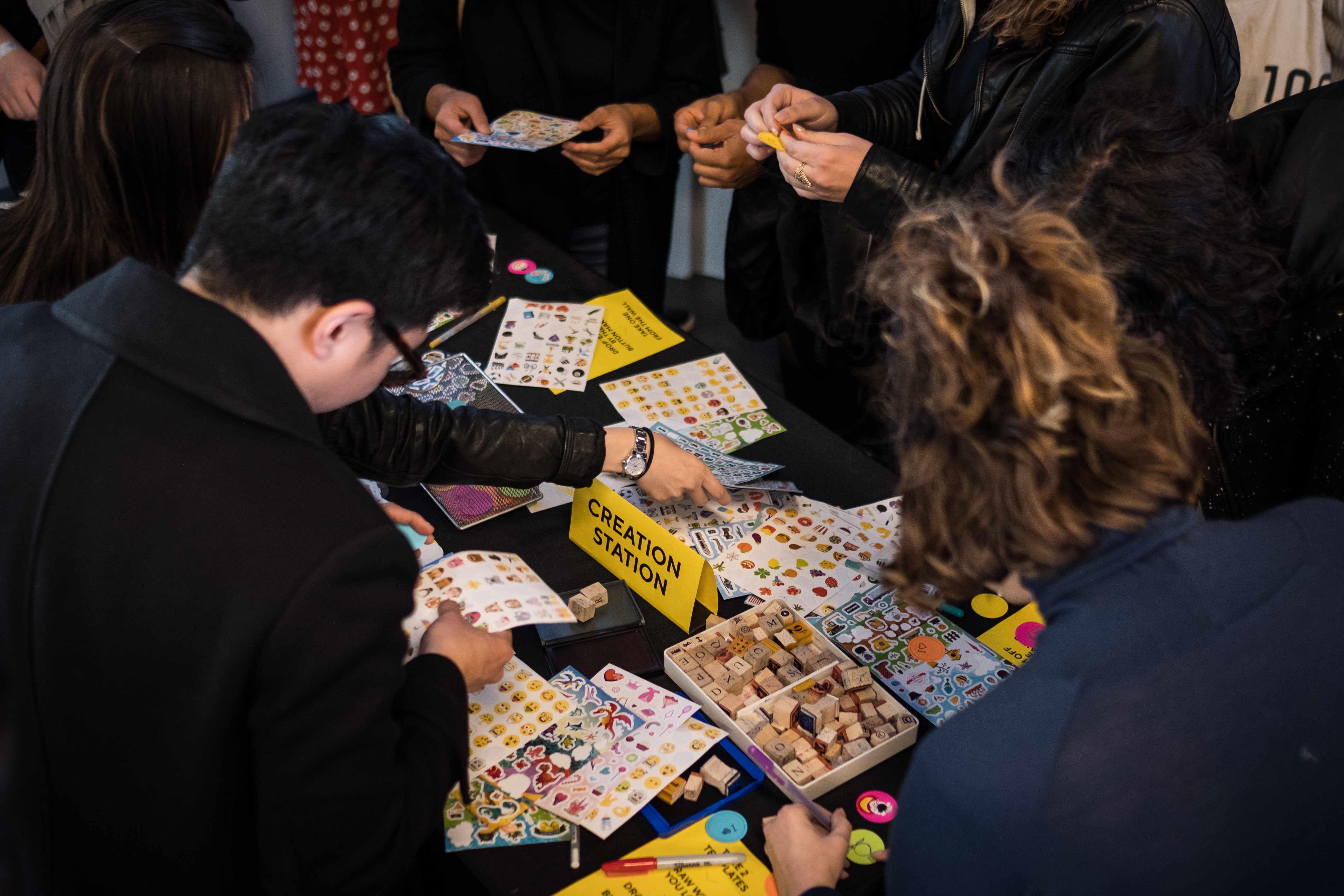 Throughout the opening night reception, visitors swarmed the students’ station, using recycled materials, stickers, and other supplies to craft hundreds of original and uplifting pins. In a creative twist, participants were invited to leave the pins they’d made and take pins made by others, which sparked community and connection throughout the evening.