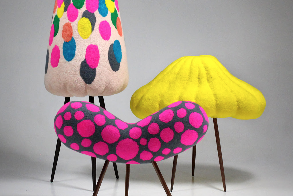 Artist Masako Miki, is debuting her art installation at SF Design Week: Mori no Yokai (shapeshifters of forest), 2019, Wool on foam, wood, vinyl. The artist recreates a new environment for the sculptures Miki exhibited at Berkeley Art Museum Pacific Film Archive early this year. The art installation is courtesy of the artist and CULT Aimee Friberg Exhibitions.