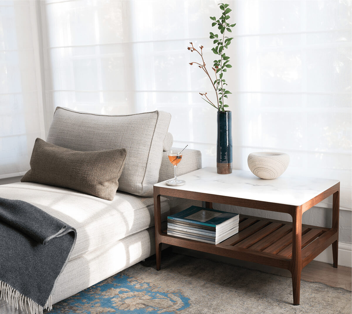 The Radius collection is a contemporary take on mid-century forms. The basic root of the design is a simple table which may be a side, coffee or console table with a change in primary dimensions. As the customer considers not only dimension but also functionality, a drawer can be added to a side table transforming it into a nightstand. Adding multiple drawers creates a dresser; adding multiple shelves creates an étagère. This line of furniture reflects the full spectrum of possibilities in terms of both dimensions and functionality without losing the underlying beauty of the Radius design.