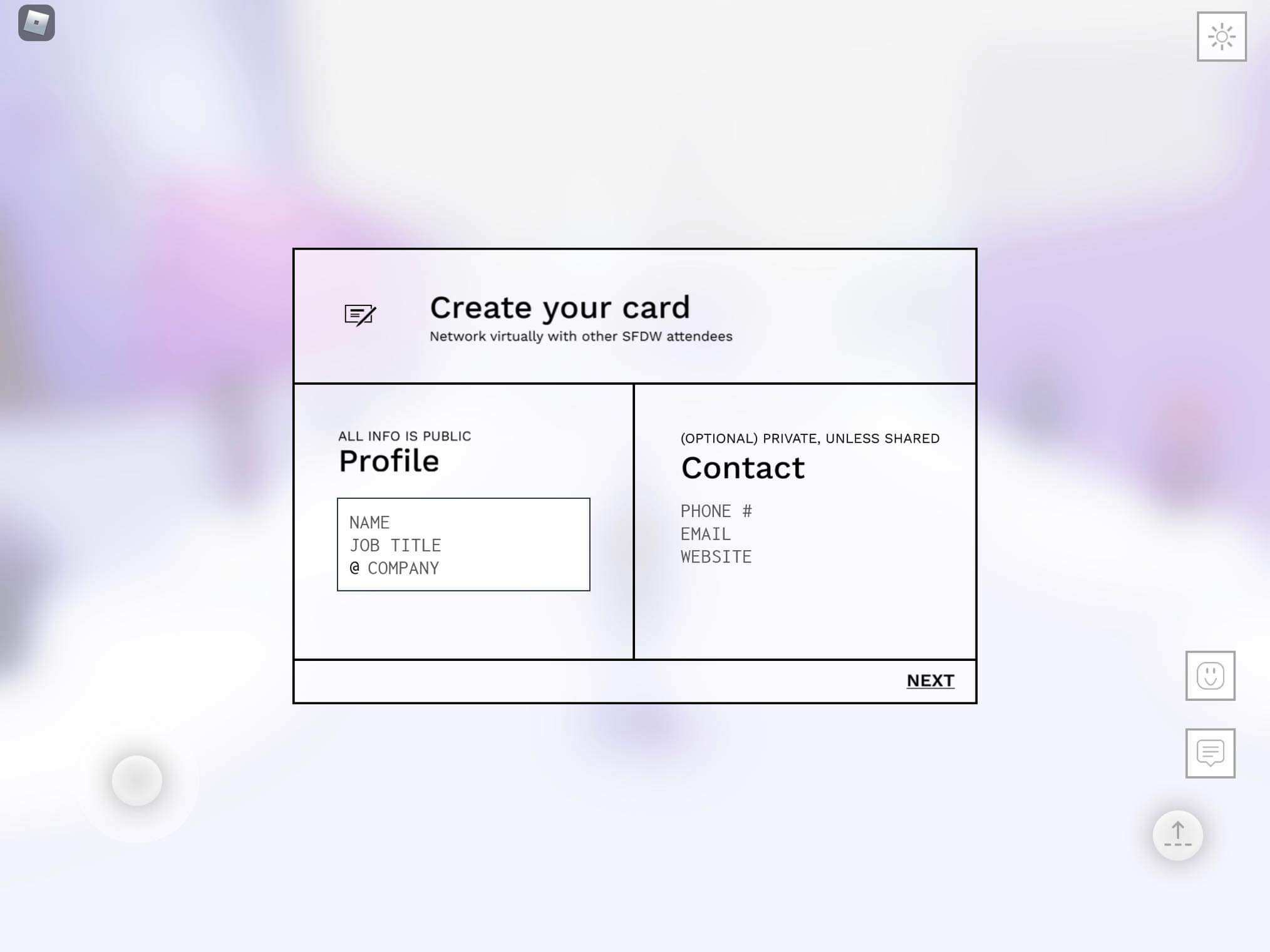 Invite your friends to meet-up at a specific time, or login to the space to meet other attendees inside a very special hub created specifically for Design Week attendees by the Roblox team! Live chat, explore the space, add your favorite quote to create installations, meet new people and exchange information, run, jump and play! Don’t forget to stop by the Imagination Space zen room for a quiet break and deep relaxing breaths in between SFDW sessions.